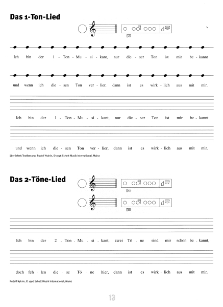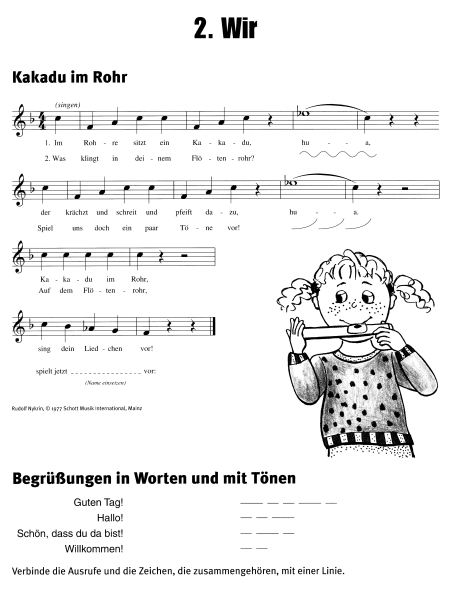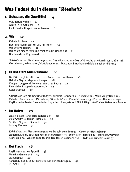 Flötenheft 1: Der Tonumfang von c'-g'' wird in kindgerechter Weise erschlossen. Es werden Impulse zum Spielen und Lernen, zum Wiedergeben und Improvisieren, zum eigenen Notieren von Musik usw. gegeben. Dem Flötenheft 1 liegt eine "Elterninformation zum Unterrichtswerk" (KAT 160-99) bei.