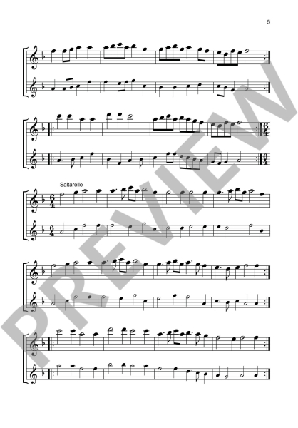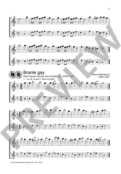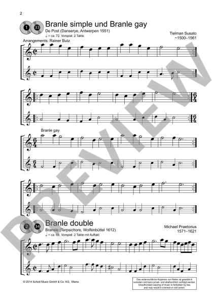 Zu allen Zeiten haben die Menschen Entspannung und Vergnügen im Tanz gefunden. Mit den folgenden Melodien wollen wir uns in längst vergangene Zeiten versetzen und ein wenig vom Lebensgefühl von Renaissance (ca. 1420-1600) und Barock (ca. 1600-1750) erwecken. Viele der Melodien waren damals weit verbreitet und sind bis heute im musikalischen Gedächtnis geblieben. Üblich war es, die Tänze zu kleinen Suiten aus Tanzpaaren langsam-schnell zu kombinieren. Meist steht der langsame Schreittanz im Zweiertakt, der rasche Springtanz im Dreiertakt, und des Öfteren werden sie durch dieselbe Tonfolge in unterschiedlichen Taktarten reizvoll miteinander verbunden. Üblicherweise wurde ein Tanz mehrfach mit improvisierten Variationen wiederholt. Um den Gang durch die Geschichte unmittelbarer erlebbar zu machen, folgt die Anordnung den Tanztypen von Renaissance und Barock und nicht dem Schwierigkeitsgrad. Dieser hängt bei einem Tanz nicht zuletzt von seinem jeweiligen Tempo ab. Eher langsame Tänze sind Branle simple, Basse dance, Ronde, Pavane, Siciliana, Allemande, Sarabande, Menuett und Chaconne. Eher rasche Tänze sind dagegen Branle gay, Saltarelle, Galliarde, Courante, Gigue, Passepied, Gavotte, Bourrée und Hornpipe. Zur Übung sollte man ohnehin alle zuerst langsam einüben und dann das Tempo allmählich steigern. Ganz so wie die Schritte in der Tanzstunde.
