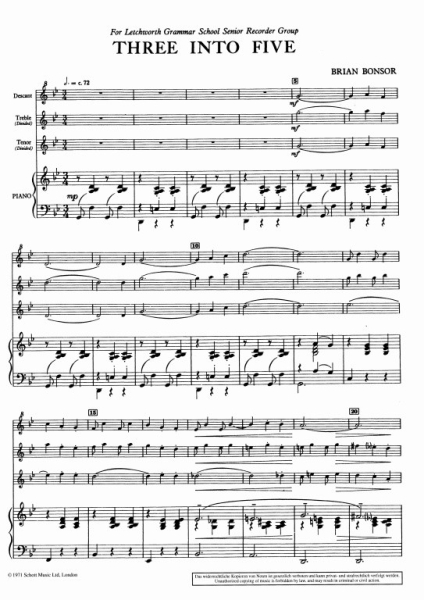 Obsazení: Blockflöten (SAT, divisi, 3 oder 5 Blockflöten) und Klavier