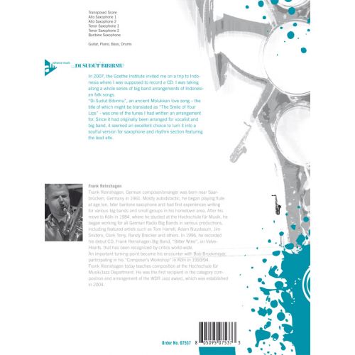 “Di Sudut Bibirmu”, an ancient Molukkan love song – the title of which might be translated as “The Smile of Your Lips” - was one of the tunes I had written an arrangement for. Since it had originally been arranged for vocalist and big band, it seemed an excellent choice to turn it into a soulful version for saxophone and rhythm section featuring the lead alto.