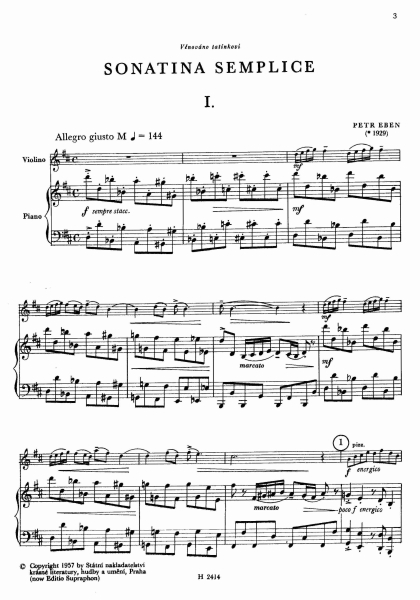 Skladatel Petr Eben (1929-2007) vždy přál domácímu muzicírování a pro hudební amatéry zkomponoval řadu skladeb. Půvabná a nekomplikovaná Sonatina semplice je určena flétně nebo houslím s doprovodem klavíru. Revidoval Bohuslav Purger (housle) a Václav Žilka (flétna).