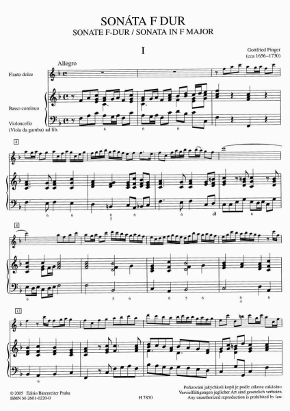 Tvorba olomouckého rodáka Gottfrieda Fingera (cca 1656-1730) zahrnuje vedle několika oper mnoho sonát a triových sonát pro různé nástroje a číslovaný bas. Řada z těchto skladeb byla vydána tiskem za Fingerova života. Sonáta F dur pro altovou zobcovou flétnu a basso continuo vyšla ve sborníku deseti flétnových sonát op. 3 někdy kolem roku 1700 v Amsterodamu. K novému vydání ji připravil a číslovaný bas vypracoval Miloslav Klement.