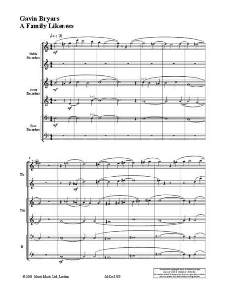 "A Family Likeness" wurde für The Society of Recorder Players in England geschrieben und 2008 mit großem Erfolg uraufgeführt. Die Musik ist charakteristisch für Gavin Bryars und wäre eine ideale Einführung in seine einzigartige Klangwelt voll langsamer reiner Harmonien und melodischer Ostinati, die eine weite Landschaft heraufbeschwören. Diese bedeutende Ergänzung zum modernen Blockflötenrepertoire ist ein großartiges Konzertstück, das nicht nur zugänglich, sondern auch musikalisch dankbar ist; es kann von sechs Einzelspielern oder auch von einer größeren Gruppe mit mehreren Spielern pro Stimme aufgeführt werden.