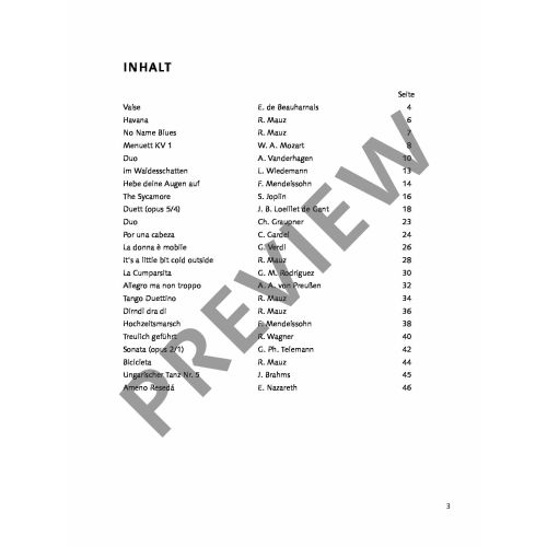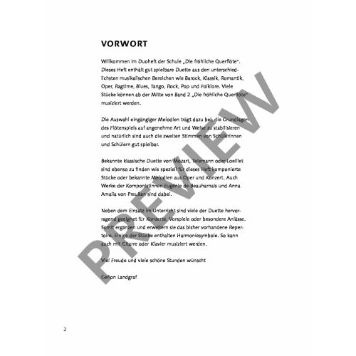 Diese Zusammenstellung von Flötenduetten enthält abwechslungsreiche Melodien aus Klassik, Oper, Ragtime, Tango, Folklore u.v.m. Die Auswahl eingängiger Melodien trägt dazu bei, die Grundlagen des Flötenspiels auf angenehme Art und Weise zu stabilisieren. Neben dem Einsatz im Unterricht sind viele der Duette hervorragend geeignet für Konzerte, Vorspiele oder besondere Anlässe. Das Heft kann zur Erweiterung des Repertoires ab der Mitte von Band 2 der Schule „Die fröhliche Querflöte“ genutzt werden.