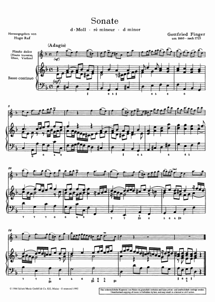 Obsazení: Alt-Blockflöte (Flöte, Oboe, Violine) und Basso continuo; Cembalo (Pianoforte), Violoncello (Viola da gamba) ad lib.