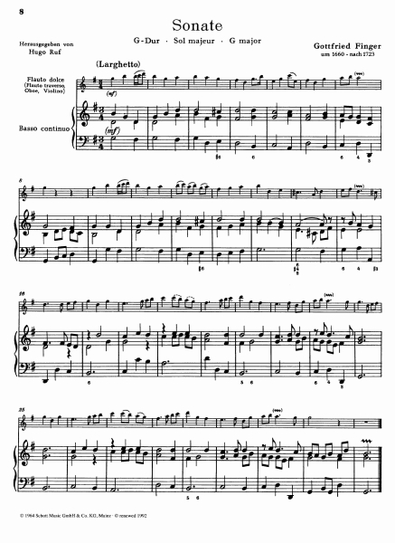 Diese Blockflötensonaten von Gottfried Finger sind einem Druck des Londoner Verlegers John Walsh entnommen. Die hübschen Stücke, die in Anlage und Erfindung den etwa gleichzeitig anzusetzenden Blockflötensonaten von Daniel Pucell (ED 3693 und 4732) ähneln, dürften kurze Zeit nach Fingers Eintreffen in England (1685) entstanden sein. Fingers Sonaten sind musikalisch ebenso reizvoll wie die des Daniel Purcell. Die spieltechnischen Anforderungen sind bei beiden Komponisten etwa gleich gering.