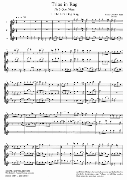Die vorliegende Sammlung nennt sich "Trios in Rag", weil der durchlaufende Beat im Interesse der Selbstständigkeit aller Stimmen fehlt. Das Schwergewicht wurde hier einerseits auf synkopierte Rhythmen und andererseits auf tonale Harmonik und Melodik gelegt. Es wurde eine gehobene Unterhaltungsmusik geschaffen, die vor allem Freude am gemeinsamen Musizieren wecken soll.