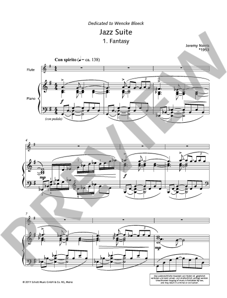 Trotz des reichen und lebendigen Repertoires gibt es nur wenige Kompositionen für Flöte und Klavier, die man wirklich „Jazz-inspiriert“ nennen könnte. Diese Lücke möchte Jeremy Norris mit seiner „Jazz Suite“ schließen. Ihre musikalische Sprache ist durch synkopische und Swing-Rhythmen und durch vom Blues inspirierte Harmonien und Melodien charakterisiert. Der Instrumentalsatz erinnert vage an die Musik von Earl Hines, Benny Goodman oder Dave Brubeck. Tauchen Sie ein in „Fantasy“, „Piano bar blues“, „La parisiènne“, „Déjà vu“ und „Time out“.