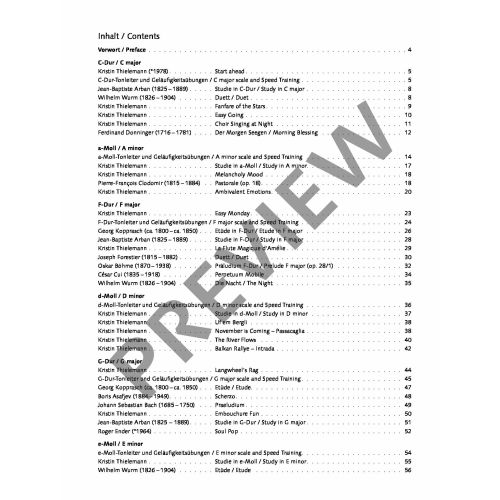 Dieses Heft macht Lust aufs Üben von Tonleitern und Etüden! Wichtige Studien und Etüden für leicht Fortgeschrittene auf der Trompete werden durch Klavierbegleitungen oder Duett-Stimmen ergänzt, eröffnen so kammermusikalische Interaktion und fördern harmonisches Hören. Auf der Reise durch die „Trompetenwelten“ werden durch geschickte Zusammenstellung von bekannten und neuen Übungen und Spielstücken auf spielerische Weise instrumentale Fitness und Geläufigkeit auf der Trompete ausgebaut. Das Heft behandelt Dur- und Molltonarten bis zwei Vorzeichen. Begleitmaterialien wie Klavierstimmen und Demo-Versionen, eingespielt von namhaften Künstler:innen, runden das Angebot ab.