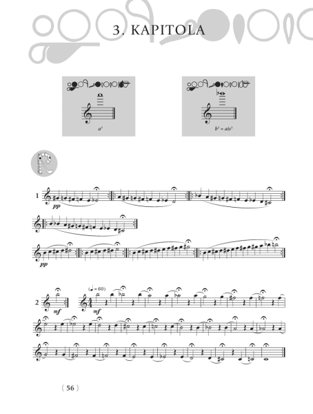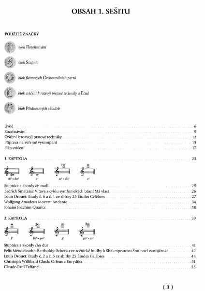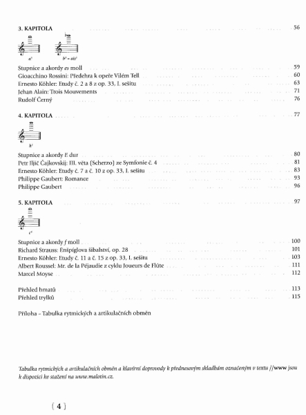 - samostatně vložená tabulka rytmických a artikulačních obměn, přehled hmatů a trylků v celém rozsahu flétny