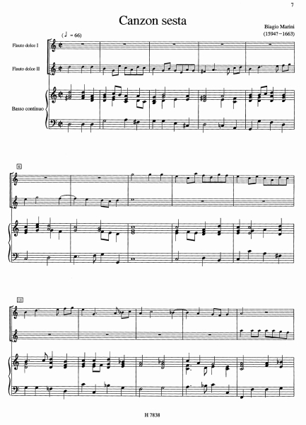 Italský skladatel Biagio Marini proslul na počátku 17. století jako houslový virtuos. V jeho odkazu nalezneme řadu sonát, sinfonií a tanců pro rozmanité obsazení. Tři skladby pro zobcové flétny s doprovodem klávesového nástroje pocházejí ze sbírky Sonate, symphonie, canzoni e retorneli op. 8, vytištěné v Benátkách roku 1629.