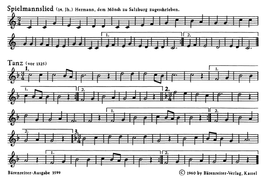 13 einstimmige und drei zweistimmige Spielstücke anonymer Spielleute des 13. und 14. Jhs. für Sopranblockflöte oder andere Instrumente,Zupf- und Schlaginstrumente ad lib.