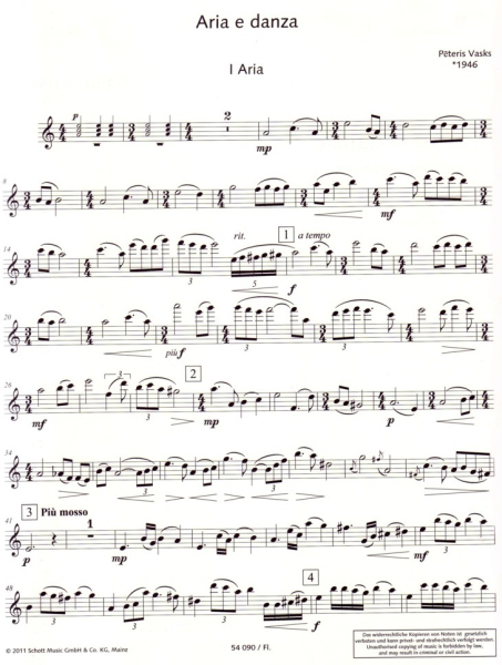 Pēteris Vasks hat die Literatur für Flöte und Klavier um zwei Stücke bereichert, die zum häuslichen Musizieren ebenso geeignet sind wie für Aufführungen im Konzertsaal. Die "Aria" ist eine sanfte, meditative Zwiesprache zwischen Flöte und Klavier in a-Moll. Das zweite Stück, "Danza", ist ein stilisierter Tanz mit urwüchsiger Rhythmik, archaischer Harmonik und neckischer Melodik, die auf folkloristischem Grund wurzelt. Pēteris Vasks wurde 1946 in Lettland geboren. Seine Musik bildet häufig eine Symbiose aus Techniken Alter Musik und moderner Musik. Hier wie in den meisten anderen Werken des Komponisten spielt seine Verbundenheit mit der Natur eine besondere Rolle. Wie kaum ein anderer Komponist verleiht er der Natur eine musikalische Stimme.
