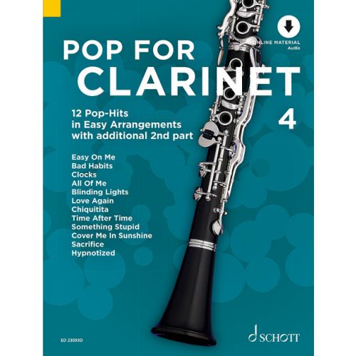 Die schönsten Popsongs, bekannte Filmmelodien und zeitlose Evergreens: Band 4 der Reihe Pop For Clarinet enthält 12 leicht gesetzte Arrangements für 1-2 Spieler mit passenden Playbacks zu jedem Song. Aktuelle Chart-Hits wie Easy On Me oder Blinding Lights stehen neben den Pop-Klassikern Time After Time und Clocks. Echte Highlights für Klarinette sind Something Stupid, All Of Me und eine neue Bearbeitung des Abba-Klassikers Chiquitita.