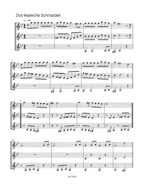 Elf jiddische Melodien, mit dem typischen, leicht melancholischen Touch versehen, sind in diesem Heft versammelt. Wenn gleich drei Klarinetten erklingen und auch die Harmonien sonor und beschwingt zum Gesamtbild beitragen, verstärkt sich die Wirkung noch einmal deutlich.