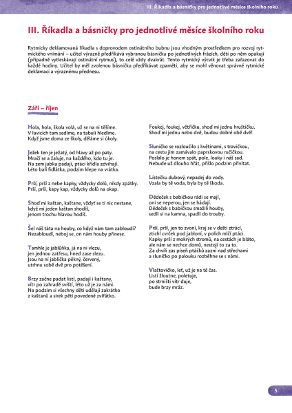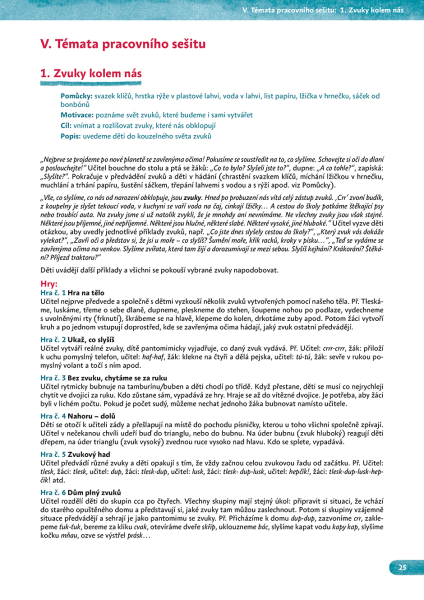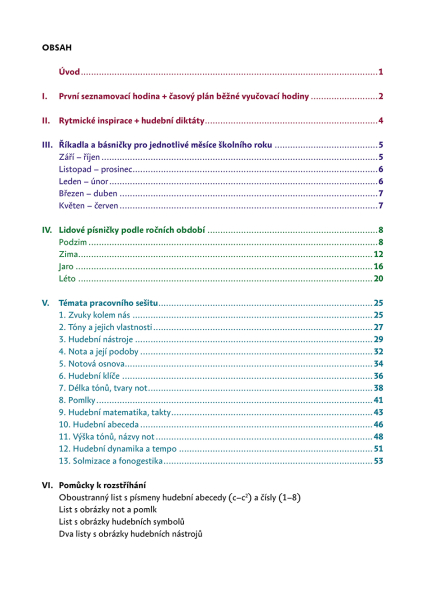 je soubor 32 volných listů v deskách (formát A4, tisk na tvrdším papíru) s přehledně rozvrženou výukovou látkou postavenou na 13 tématech z hudební prvouky. Témata a jejich řazení, odpovídající časovému plánu jednoho školního roku, plně korespondují s náplní Pracovního sešitu pro děti.